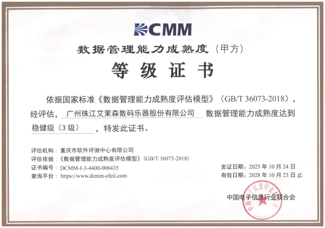 当乐器制造智慧遇见现代数据治理体系,会碰撞出怎样的革新火花?近日,珠江艾茉森正式通过***认证,荣获 “数据管理能力成熟度(DCMM)甲方稳健级(3级)证书”。这标志着珠江艾茉森在数据战略、治理与应用领域,已建立起科学、规范且持续优化的管理体系,在乐器制造行业数字化转型浪潮中走在了前列。